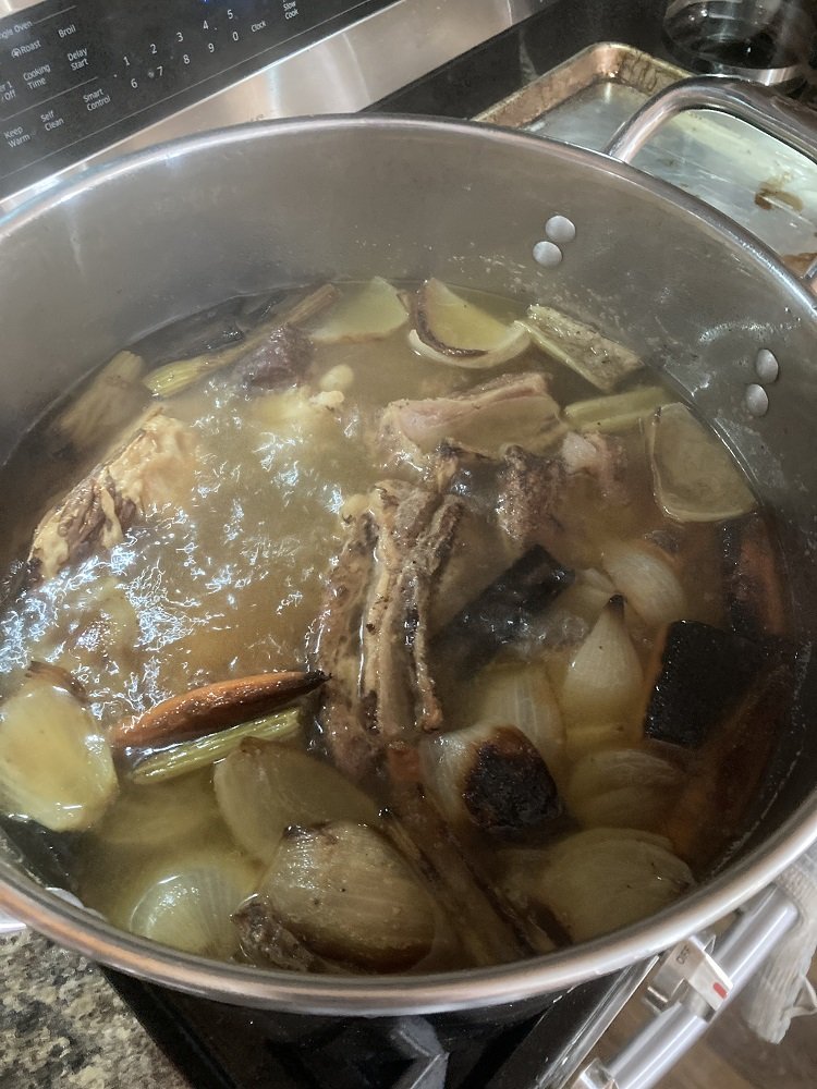 Blanch the bones. Place the bones in a stock pot large enough to cover them completely with water. Use two stock pots if needed. Bring water to a boil and simmer for 20 minutes, then drain and rinse the bones with water.