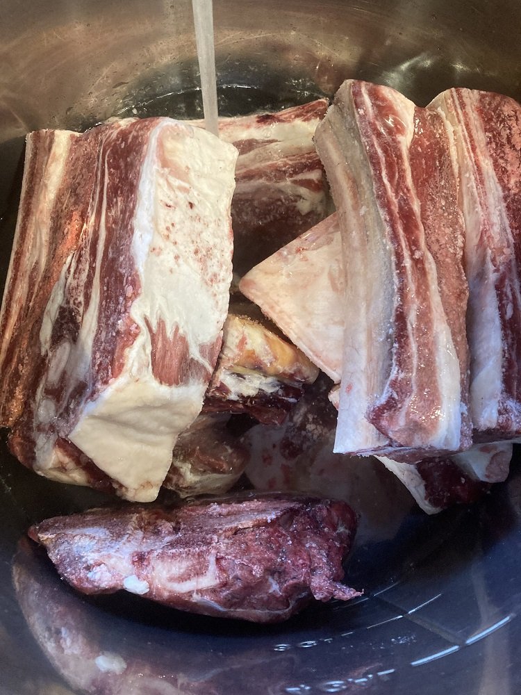 Bone to broth ratio. For this batch, I used 12 pounds of soup bones and short ribs to make 2 gallons of finished broth. The consistency of the cool, finished broth was slightly gelatinous which is great. There’s no perfect ratio. I like to see that the broth is concentrated enough to be more gelatinous than soupy when cooled.