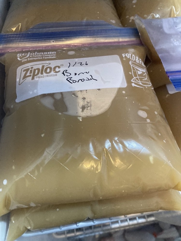 Store the broth. Bone broth freezes well in quart sized freezer bags for use in future recipes.
