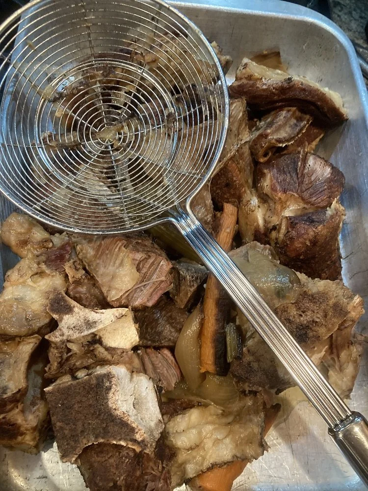 Strain the broth. Remove the bones and vegetables with a wire basket or tongs. Pour the broth through a fine mesh strainer to remove any small loose pieces of bone. Set the broth aside to cool.