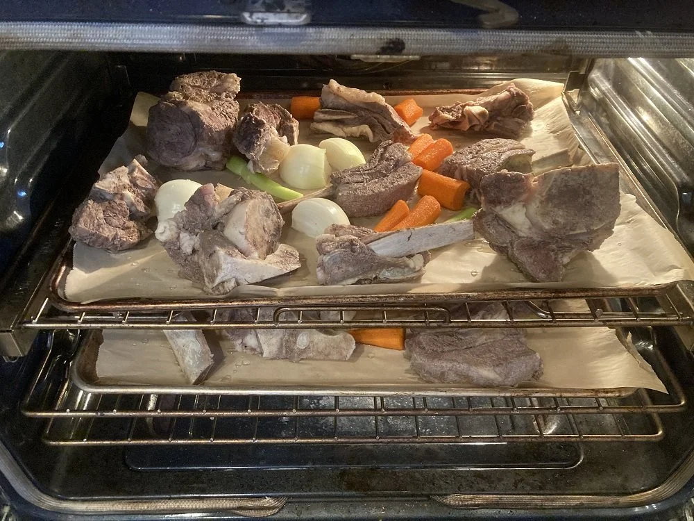 Roast the bones and vegetables. Preheat the oven to 450 degrees F. Arrange the bones and vegetables in a single layer on baking sheets. Roast for 3o minutes. Turn the bones and vegetables and then roast for another 20-30 minutes.