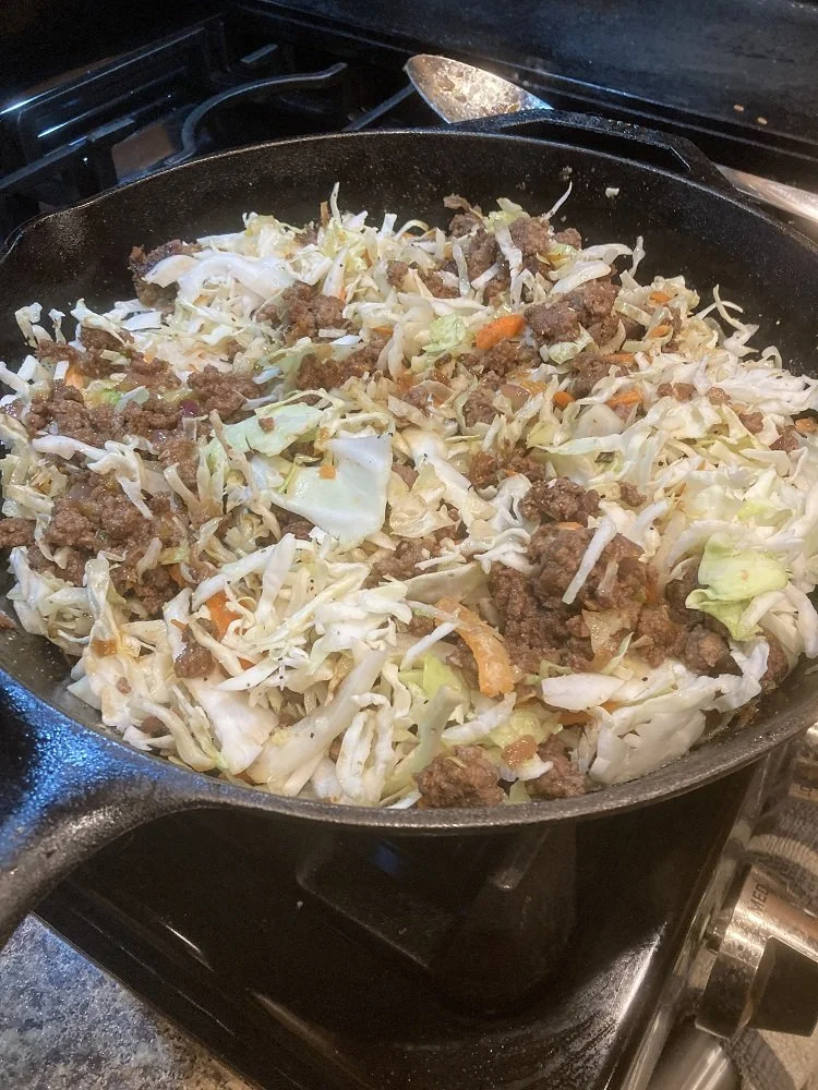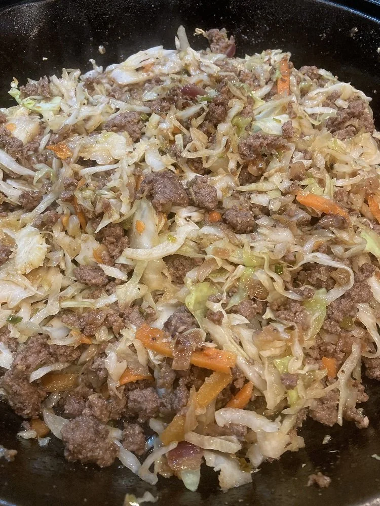 Cook the egg roll mixture, stirring frequently, until the cabbage is tender. Approximately 5 minutes.